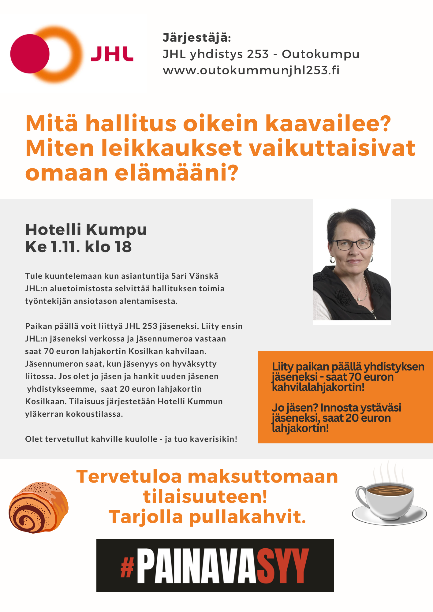 ”Ammattiliitto JHL vastustaa hallituksen tylyä leikkauslinjaa yhdessä muiden SAK:n liittojen kanssa. Aloitamme syyskuussa PainavaSyy-mielenilmaukset hallituksen politiikkaa vastaan. Nyt sinunkin on aika toimia ja pelastaa suomalainen työelämä.”